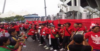 Berdasarkan pantauan wartawan Kompas.com, Ary Wibowo, di Stadion Bukit Jalil, ratusan suporter tersebut kompak menyanyikan yel-yel "Garuda di Dadaku". Suporter yang sebagian besar memakai atribut timnas Indonesia itu memadati daerah dekat pintu kuning stadion.